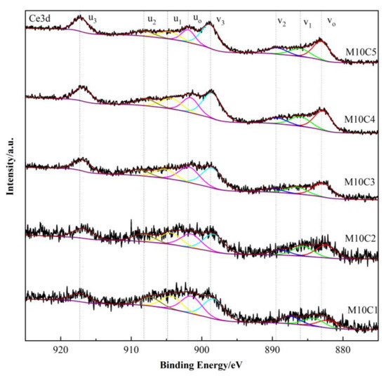 Figure 14 shows the XPS spectrum of the Ce3d orbital of the M10C1~M10C5 catalyst. The peaks at u1 and v1 represent the peaks of Ce3+3d3/2 and Ce3+3d5/2, respectively. The peaks at u0, u2 and u3 and v0, v2 and v3 are Ce4+3d3/2 and Ce4+3d5/2, respectively. The coexistence of Ce3+ and Ce4+ facilitates the storage and release of oxygen [30]. The presence of Ce3+ is more conducive to the generation of oxygen voids and can improve the denitration effect of the catalyst and the mercury oxidation rate [1]. The relative content of Ce3+ in the sample increased first and then decreased with the increase in the Ce content, which was the highest in M10C3 (25.31%).