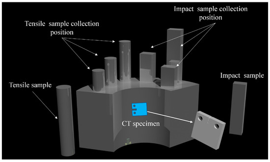 Figure 1 presents the specific piece positions that were used for further tests. The room temperature tensile properties for each specimen were measured using 5 samples with a gauge length of 35.6 mm and a diameter of 8.9 mm. The specimens were tested on a CMT5105 universal testing machine (Tianjin Meitesi Testing Machine Factory, Tianjin CN) at a strain rate of 1 × 10−3 s−1.