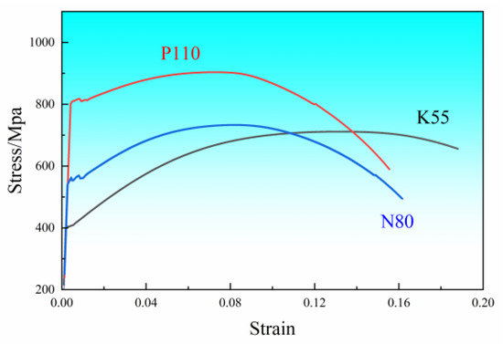 In general, the higher uniform elongation and strain hardening exponent of materials can avoid localized plastic deformation and ensure the security of the casing service, particularly under the condition of an incidental larger overload. When uniform deformation and strain hardening occur in the materials, it can lead to plastic deformation transferring to the non-plastic deformation zone from the plastic deformation zone and ensuring the security of the casing service. Based on this viewpoint, it can be forecasted that K55 steel possesses higher accidental overload resistance compared to both P110 and N80 steels, although both the tensile and fatigue strengths are low.
