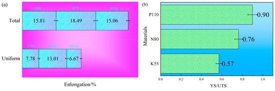 The elongations of the K55, N80, and P110 steels are shown in Figure 4a, and it can be found that the uniform elongations of both N80 and P110 steels were obviously lower compared to that of K55 steel, which indicates that K55 steel may possess a superior strain capacity. This can be attributed to the fact that the yielding in the soft ferrite phase of K55 steel occurred at first, then the load transferred to the hard pearlite phase [20,21].