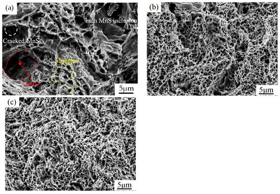 The fractographies of the tensile specimens, as shown in Figure 5, show that the microstructures of the fracture surfaces included smaller dimples for the N80 and P110 specimens. This was due to the fact that their microstructures mainly consisted of TM, the dimples originating from the carbides of the tempering martensite. The fractographic investigations indicate that a fracture mechanism of microvoid growth and coalescence occurred in the TM fracture (Figure 5b,c). On the other hand, in the K55 tensile specimens, larger sulfide inclusions were present in the matrix, which resulted in the appearance of some larger caves on the tensile fracture surface of the K55, as shown in Figure 5a.