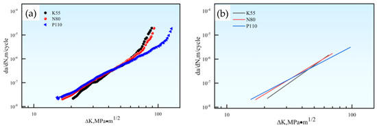 Curves (da/dN versus ∆K) for three types of casing drilling steels: (a) Fatigue crack growth curves for three types of casing drilling steels; (b) Paris’ law curves for three types of casing drilling steels.