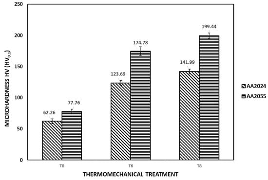 - Vickers microhardness values of 77, 174, and 199 were obtained in the AA2055 alloy with the heat treatments T0, T6, and T8 respectively. These are higher values than those obtained in the AA2024 alloy in the same heat treatments;