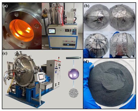 Preparation process diagram of HEAs Powders. (a) Vacuum arc melting process diagram, (b) Different high entropy alloy ingots, (c) The device of gas atomization, (d) The HEAs powders.
