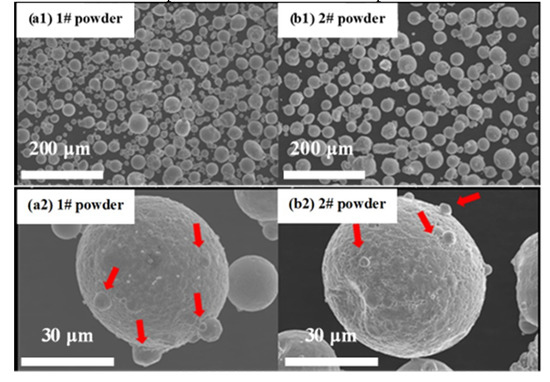 Figure 4 shows the overall surface SEM morphology of 1# and 2# powders and the partially enlarged view of larger particles. It can be seen from Figure 4a1,b1 that the particles of the two kinds of powders are relatively uniform, basically spherical, with good spherical regularity, indicating that they have good powder flowability [26]. There are satellite spheres on the surface of powder particles with larger particle sizes, and the larger the particle size, the rougher the surface and the more prone to defects. The fine particles bonded to the surface of the particles with larger particle sizes are mainly caused by the different solidification speeds of the powder. The difference in solidification speed between large and small powders may be due to the difference in volume. When the droplets have solidified, the large droplets may still be in a liquid or semi-solid state, and these small particles in the solidified state may be embedded on the surface of large particles when they collide with unsolidified large particles (Figure 4a2,b2). Another reason may be that there are more defects on the surface of larger powders, which can provide more nucleation sites for the subsequent formation of satellite spheres.