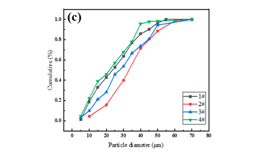 - The powders possessed good fluidity and the particle size was mainly 10–50 μm. The characterization results showed that the surface roughness of powder particles was largely related to their size. The larger the particle size was, the more significant the surface roughness was.