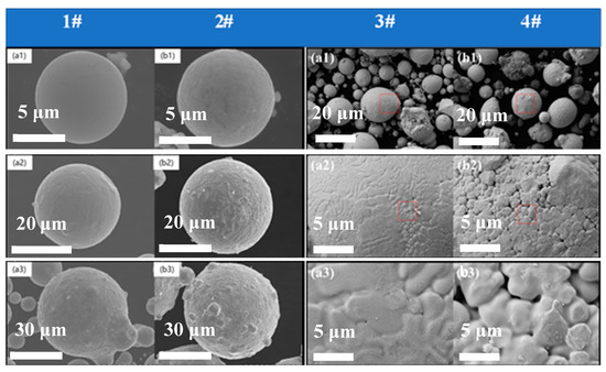 Surface morphology of four kinds of high entropy alloy powders in different particle size ranges. (a1,b1) The size range of powders less than 10 μm of four powders. (a2,b2) The size range of powders from 10 μm to 50 μm of four powders. (a3,b3) The size range of powders is larger than 50 μm.