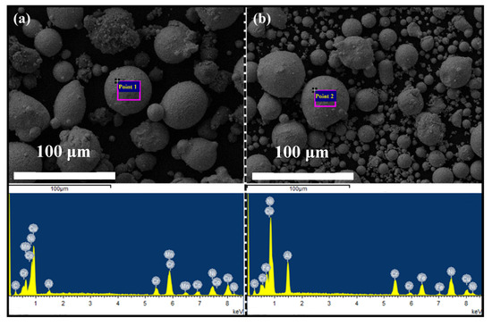 SEM morphology and EDS results of (a) 3# and (b) 4# high entropy alloy powders.