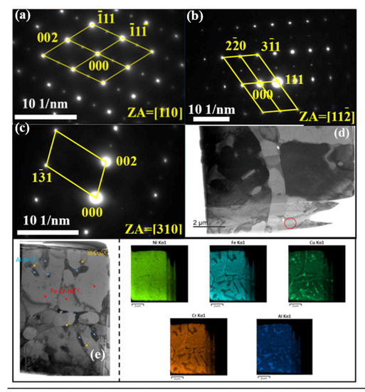 Figure 8a–d displayed the TEM and corresponding selected electron diffraction (SAED) calibration results of 4# powder. From the electron diffraction pattern, one can find that the dendrite region was an FCC solid solution phase rich in Co, Ni, and Cu, which was consistent with the results of the XRD examination. According to the results of energy spectrum surface scanning in Figure 8e, the Ni element was almost uniformly distributed in the sample and the distribution areas of Fe and Cr were consistent, which thus producing the dendrite-like morphology. The same phenomenon was also observed in reference [31,32,33]. Al element was distributed among dendrites and Cu element was mainly distributed at the interface around the Al element. Fe, Cr, and Ni elements as the main component were located at the dendrite region. Since the mixing enthalpy of Al and Ni elements was the lowest, they were enriched in inter-dendritic. The mixing enthalpy of Cu, Fe, and Cr elements was relatively higher than that of Al and Ni elements. Therefore, it was expelled from the dendrite region and was distributed near the Al-Ni region. In addition, it can be seen from Figure 9 that a small number of dislocation lines were found in the dendrite grains of the alloy (shown by the red arrows), which might be resulted from the stress concentration generated during gas atomization. Another reason for this was that the Al element intensified the lattice distortion effect of the high entropy alloy, thereby reducing the systematic stacking fault energy. For face-centered cubic (FCC) structure metals, no obvious twins were generated during tensile deformation at room temperature due to their sufficient slip system. The main slip plane of alloy dislocation movement was generally a lattice plane and the slip direction was <110> lattice direction.