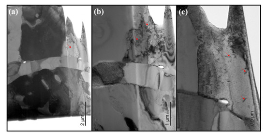 (a–c) TEM morphology of 4# high entropy alloy powder. The red arrows indicated the dislocation lines.