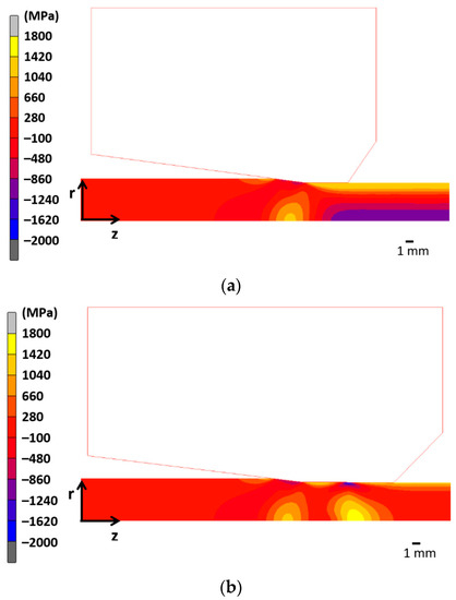 With regard to the hydrostatic stress distributions (Figure 5b), a similar effect is observed but, in this case, the initial compressive stress zone (0 < r < 3.5 mm) becomes slightly tensile at the wire core surroundings (0 < r < 2.0 mm) for reduction ratios λ = 1/12 and λ = 1/6. As in the case of axial stress, the distribution of the hydrostatic stress obtained for the lowest reduction ratio (λ = 1/24) exhibits a zone of compressive stress near the wire surface (4.0 mm < r < 5.2 mm) and a tensile stress zone in the middle of the wire radius (2.0 mm < r < 4.0 mm) becoming compressive at the wire center.