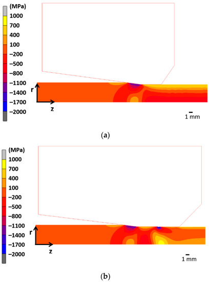 To reveal the influence of the secondary reduction (∆d2 in Figure 1b) on the residual stress and strain states after wire drawing with modified drawing dies, four different numerical simulations of the first step of a commercial wire drawing process were carried out. In this drawing step, the cross-sectional area of the wire is reduced from an initial diameter d0 = 12.0 mm to a final one d1 = 10.8 mm (wire radius, a = 5.4 mm). For the modified drawing dies including the skin pass zone, the whole drawing step diameter reduction (Δd = 1.2 mm) is divided into two consecutive reductions: the main reduction (∆d1 in Figure 1b) and the secondary reduction (∆d2 in Figure 1b).