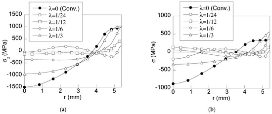 Figure 5a,b reveals the secondary reduction (∆d2) as a key parameter in the redistribution of residual stress after cold drawing with modified dies including a skin pass soft reduction. Thus, for high secondary reduction (λ = 1/3), the shape of both axial and hydrostatic stress distributions are similar to that obtained in a conventional process. This way, in the axial stress distribution shown in Figure 5a, a tensile stress zone appears close to the wire surface (3.8 mm < r < 5.4 mm) and lowers with depth (x = d/2 − r) up to becoming of compressive nature for r < 3.8 mm with the same decreasing trend up to the wire core. Nevertheless, the stress distribution is deeply changed for low values of the reduction ratio λ. Thus, the tensile stress zone is narrower (4.2 mm < r < 5.4 mm) and compressive stresses are distributed almost uniformly at the inner points. In the case of the lowest reduction ratio (λ = 1/24), a compressive zone appears placed close to the wire surface (3.8 mm < r < 5.1 mm). As results, a tensile zone is found at the half of the wire radius (0.8 mm < r < 3.8 mm) with a slight compressive zone near the wire center.