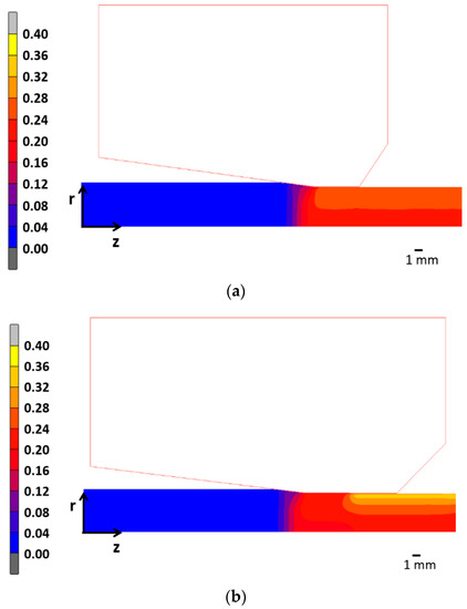 In a similar way, Figure 6 shows the equivalent plastic strain field during wire drawing and Figure 7 shows the radial distribution of equivalent plastic strain, from the wire center at the wire symmetry axis r = 0 to the wire surface r = 5.6 mm, obtained in the wire drawn with diverse secondary reduction degrees compared with the one obtained in a conventional cold drawing (filled circles).