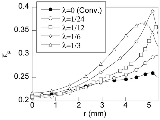 As can be noticed in Figure 7, the highest increment of the maximum equivalent plastic strain (obtained for λ = 1/6) is around 50% higher than the one obtained with a conventional drawing whereas for the other cases of study is around 35% (λ = 1/12) and 20% (λ = 1/24) respectively. In addition, Figure 7 reveals that the position where the maximum equivalent plastic strain appears is also affected by the reduction ratio λ. Thus, for low secondary reductions (λ = 1/12 and λ = 1/24) the maximum is placed at the wire surface and, as this parameter is increased, the position of such a maximum is moved towards inner points of the wire.