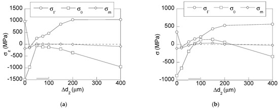 Thus, the optimal case from the mechanical point of view for reducing the residual stress state is within the range of values between ∆d2 = 50 μm and ∆d2 = 100 μm (shaded line in Figure 8), since within such a zone, the lowest values of the stress at the wire surface and at the wire core are obtained without significantly increasing the average stress. Unfortunately, the maximum reductions at the wire surface and at the wire core are not reached for the same value of secondary reduction. So, the optimum case depends on if the maximum stress reduction has to be located at the wire core or at the wire surface.