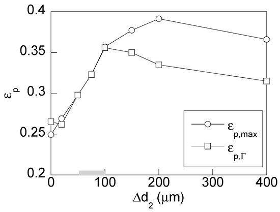 With regard to the equivalent plastic strain (Figure 9), the maximum plastic strain and the plastic strain at the wire surface are similar for low values of the secondary reduction up to ∆d2= 100 μm (λ = 1/12). For these cases, the equivalent plastic strain increases with the value of ∆d2 and for high secondary reductions, the equivalent plastic strain at the wire surface is progressively reduced. However, the maximum plastic strain is still increased up to a reduction ratio of λ = 1/6 (∆d2 = 200 μm), and later it decreases for higher reduction ratios. Within the optimal zone according to stress reductions analyzed in Figure 8, ∆d2 ∈ (50 μm, 100 μm), the increment of plastic strains is within the range 20–40% compared to the values obtained for a conventional drawing. According to these results, the maximum value of the equivalent plastic strain is always reached at the wire surface for values included within the optimal range. This fact means that the inwards gradient of equivalent plastic strains is negative and, consequently, it acts against hydrogen diffusion towards the inner points of the wire.