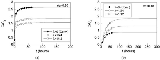 Finally, the first-order differential Equation (5) can be solved by programming the time-marching numerical scheme proposed for diffusion-type equations [46]. This way, for the m-th time interval [tm–1,tm], the nodal concentration values Cm–1 and Cm are obtained from the following equation: