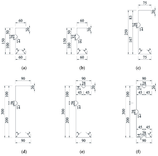 Six groups of sections are chosen with web heights of 150 mm, 250 mm, and 300 mm and flange widths of 60 mm, 75 mm, and 90 mm, respectively, in order to study the impact of the V-stiffeners’ size, section height-to-width ratio, and position of the web and flange on the bending load capacity and buckling mode of the lipped channel stainless steel members. Specimens SP-1 and SP-2 are used to compare the impact of the V-stiffeners on buckling performance, and specimens SP-3 and SP-4 are used to study the effect of the section height-to-width ratio on the buckling characteristics. Specimens SP-4, SP-5, and SP-6 are compared to study the effect of the V-stiffeners’ positions on the web and flange. Specimen SP-4’s web compression zone is V-stiffened at 1/3 height near the compressed flange, and no V-stiffeners are set up on the flange; specimen SP-5’s web compression zone is V-stiffened at 1/3 height near the compressed flange and in the middle of the compressed flange, and specimen SP-6 is V-stiffened at 1/2 web height and in the middle of the compressed and tensioned flange. Each test group comprises two C-shaped specimens with identical cross-sections, for a total of 12 specimens. Figure 1 depicts the specimen’s cross-sectional shape and all dimensions in mm.