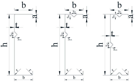 The specimens are cold-formed, utilizing stainless steel plates with a nominal thickness t of 2 mm. Figure 2 outlines the geometric parameters of the three different cross-sectional forms. Where, h is the height of the section web and b is the width of the section flange. All of the specimens have rolled edges with a wide c of 20 mm, the angles between the V-shaped stiffened ribs and the two plates are 90°, and the length of the specimen is 3400 mm. The bending inner diameter of the plate cross line is r = 2 mm, and the width Swb (Sfb) and height Sw (Sfh) of the web and flange V-stiffened ribs are 28 (32) mm and 14 (16) mm, respectively.