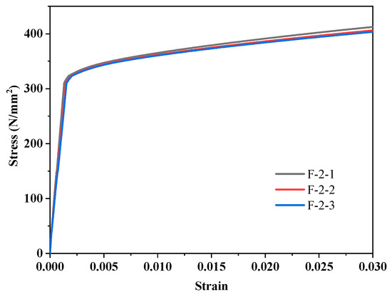Three standard tensile specimens are taken from the same batch of steel plates made of austenitic 022Cr19Ni10 stainless steel. The relevant provisions in [11,12], respectively, guide the preparation of the flange and web of the standard specimens for the material test. Table 2 provides a list of the average values of the test results, and the stress–strain curves of the stainless steel are shown in Figure 3. Where, σ0.2 is the nominal yield stress; σu is the ultimate stress value of the material; E is the initial elastic modulus of the material; δ is the elongation of the material.