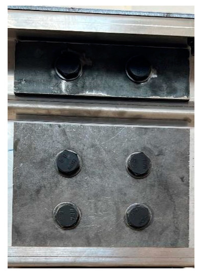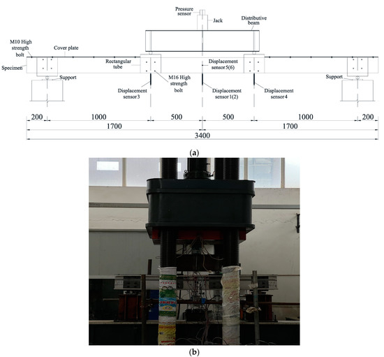 The test loading device is depicted in Figure 6a, and all dimensions in mm. Two identical specimens are connected back-to-back, and the webs of the two specimens are connected to the square steel pipe joint by M16 high-strength bolts at the supports and loading points. An external steel plate is placed at the side of the bolt contact with the specimen to prevent excessive local pressure from damaging the specimen at the bolt hole, as depicted in Figure 7. The square steel pipe and external steel plate material are both made of a Q235B grade hot-rolled steel plate. Due to friction between the webs and the high-strength bolts at the loaded square steel tube, the load is uniformly distributed to the webs of the two specimens before being distributed to the entire specimen by the webs.