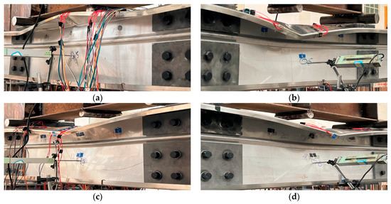 In the SP-3 and SP-4 tests, the two SP-3 specimens present different deformations, but they are more pronounced than SP-4. Only distortional buckling is visible in specimen SP-3-A, but in specimen SP-3-B, local buckling of the flange on the compressed flange in the span is also visible, demonstrating a local–distortional interaction buckling mode. The two SP-4 specimens’ deformation is essentially consistent, and both displayed distortional buckling, in addition to local buckling of the flange on the compressed flange in the span, presenting a local–distortional interaction buckling mode, as shown in Figure 9.