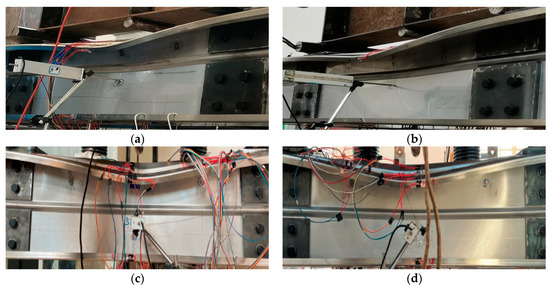 Each group of specimens in this test has 6 displacement sensors, of which 4 are set up for one constituent specimen at the compressed web, the loading point of the tensile flange, and the span of the tensile flange. These displacement sensors measure the vertical and lateral deflections of the span of the specimen and the two loading points. In order to measure the span wise and lateral deflection, the other component specimen has 2 displacement sensors at the position of the span of the tensile flange and at the compressed web, as shown in Figure 6a. The strain gauges are positioned at the mid-span section of the study section of the purely bending specimen and on both sides of the span at a length of 1/4 of the study section from the mid-span in order to check the physical alignment of the specimen before loading and to monitor the stress distribution in the study section during the test.