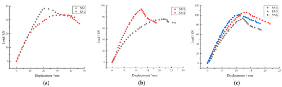 Figure 11. Load-span displacement curves. (a) Specimens SP-1~SP-2, (b) Specimens SP-3~SP-4, (c) Specimens SP-4~SP-6.