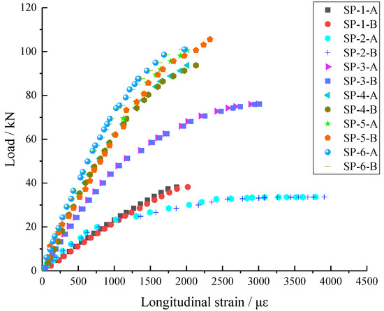 The load-span longitudinal strain curves of six groups of tests are plotted, as shown in Figure 12, using the load as the vertical axial and the longitudinal tensile strain in the span section of the tensile flange as the horizontal axial. As seen in Figure 12, the longitudinal tensile strains in the span cross-section of the two specimens tested in the same group of tests essentially follow the same trend with the load, indicating that the longitudinal tensile deformation of the two specimens is basically coordinated and that the jack load is applied uniformly to the two specimens. This confirms that the test setup has been properly aligned.
