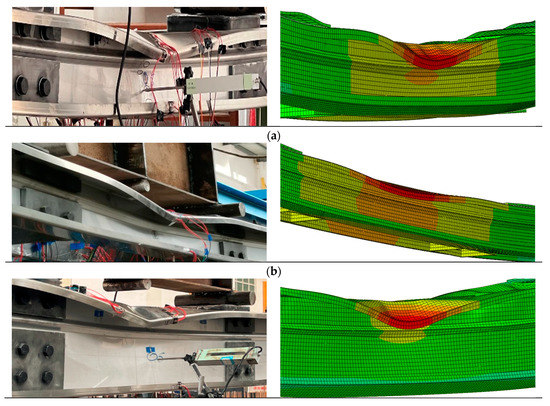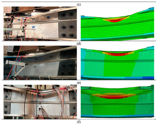 Table 4 compares the tested bending load capacity and failure mode with the finite element simulation results. The results demonstrate that the bending load capacity of the specimen obtained from the finite element simulation and the test results are in good agreement, and the difference between the two is less than 5%. The average value of the ratio between the results of the numerical simulation and the test results of the specimen’s bending capacity is 0.963, and the standard deviation is 0.022. The results also indicate that the failure mode obtained from the finite element simulation is consistent with the test results, as shown in Figure 13. It can be seen that the results of the finite element simulation accurately reflect the test, and the usage of the finite element model for the analysis of stainless steel bending members with V-stiffened lipped channel sections shows high accuracy. On this basis, many finite element parametric analysis studies of such components can be carried out.