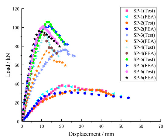 The load-span displacement curves of test and numerical simulation results are contrasted in order to compare the evolution of specimen deformation under load, as shown in Figure 14. The test results for all specimens are in good agreement with the outcomes of the numerical simulation, based on the curve change trend. The test results of the rising section of the bearing capacity curve are lower than the finite element simulation results, indicating that the stiffness of the specimen tested is smaller. The main reason is as follows: in the finite element analysis model, the whole section of the lower edge at the support rectangular tube is confined to the rigid region; in the test, the rectangular tube is placed on the round bar, and the constraint at the support is weaker, so the actual stiffness of the finite element simulation specimen is larger.