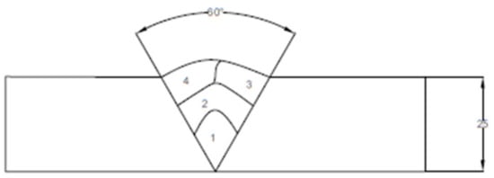 To conduct experiments, a well-prepared and designed experimental plan and programme are required. The studies were carried out using a design matrix based on fractional factorials and 125 experimental runs. The base metal for the current investigations was 300 mm × 150 mm × 25 mm of IS: 2062 (Grade A) structural steel made by Steel Authority of India Limited (SAIL). The filler material used to weld the specimen is ER 70S—6 solid wire with a diameter of 1.2 mm. Table 1 shows the mild steel’s chemical composition and key mechanical properties. The cross section of the specimen with edge preparation is shown in Figure 1. Parts 1–6 of EN 10025 are a set of European standards that define the technical delivery conditions for hot-rolled structural steel products. The current version is EN 10025:2019.