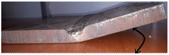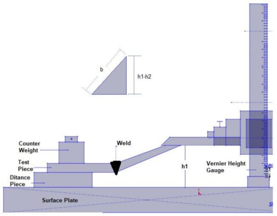 Using a laser cutter, structural steel plates (IS: 2062) of the required number of samples of 300 mm × 150 mm each were cut. A milling machine was used to prepare the edges for the oxy-acetylene gas cutting machine by cutting a single “V” groove with a 30° included angle. Cutting fluids were used to reduce residual stresses created during machining, and the depth of cut was kept as low as feasible during groove preparation. This experiment looked at four welding process variables: angle of the electrode to the work piece (q), time gap between passes (t), wire feed rate (F), and welding speed (S). 125 experiments were conducted as per the design matrix. The welding sequence is shown in Figure 1, and the number of iterations was set to four. The angle of the electrode with the work piece is one of the process variables in this experiment (θ) [48,49,50,51,52]. It was also planned to conduct an analysis of angular distortion progress by measuring angular distortion at the end of the second, third, and fourth passes of welding (passes two, three, and four, respectively). The values of angular distortion corresponding to the time gap between the passes are represented as α2, α3 and α4 respectively [53,54,55,56,57]. In this study, the angular distortion at the end of the first pass is eliminated because the process variable time gap between passes (t) refers to the time between the end of the previous pass and the start of the current pass. The angular distortion won’t be affected by the time interval between passes for the first pass because the first pass has no preceding pass. The response angular distortion (α) was measured using the following method: With the use of a vernier height gauge, the angular distortion (α) was measured using the sine bar concept. The ASTM A1030/A1030M-05 standard was used as the reference for angular distortion measurement. These established models are highly helpful in quantifying angular distortion in the negative direction, ensuring that the component will not have angular distortion after welding [58,59,60,61,62]. They can also be used to choose the best process parameters to reduce distortion in welded structures. Figure 4 illustrates the measurement principle for angular distortion. Figure 5 shows a welded specimen with varying degrees of deformation. In Table 3, the measured values of α are listed.