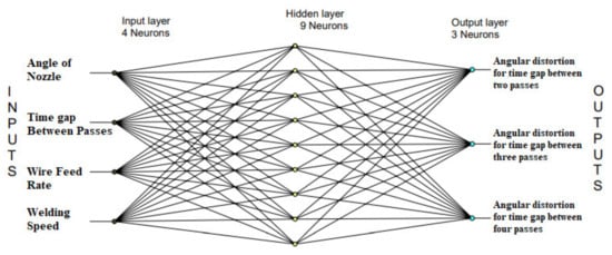 The effectiveness of the ANN model for forecasting angular distortion with time gaps of two, three, and four passes was investigated using four networks: 4-2-3, 4-4-3, 4-8-3, and 4-9-3. During each training session, a set of inputs from the training sample (‘Xi’) was presented, and the results (‘Oi’) were produced. The network model’s projected value is then compared to the actual value ‘di.’ To evaluate the results, the mean squared error (MSE) between “di” and “Oi,” as stated in Equation (8), was utilised. The algorithm’s main objective was to reduce the mean squared error for all experimental data. [39,40].