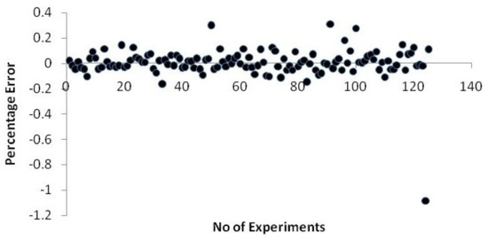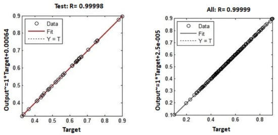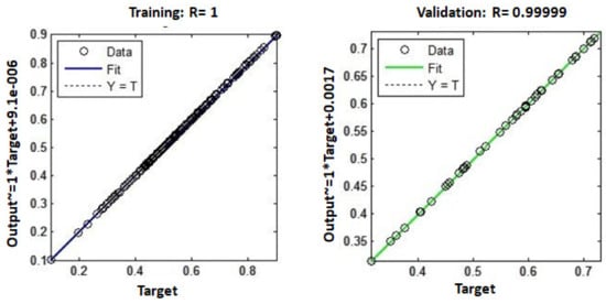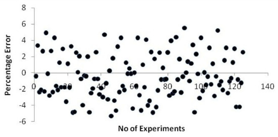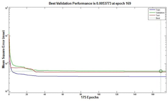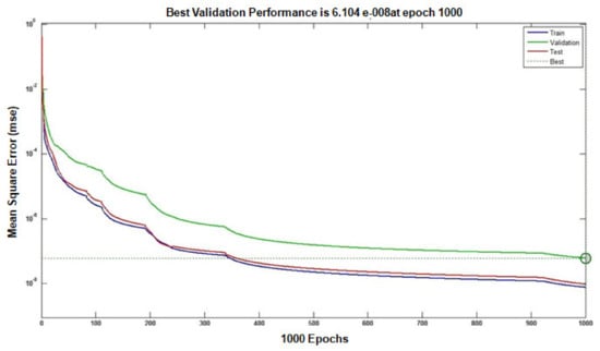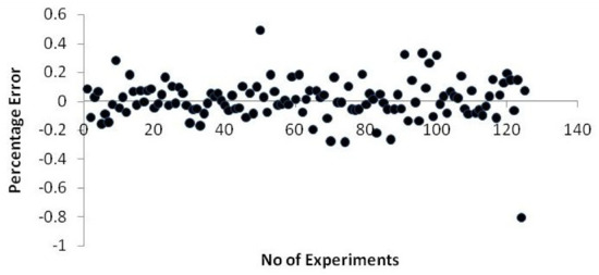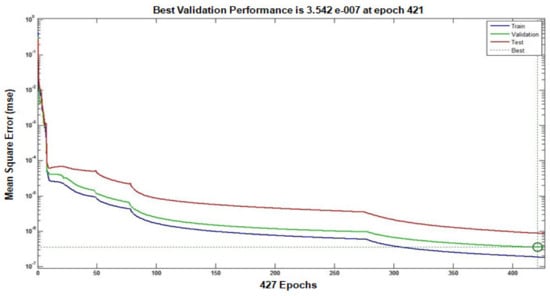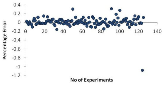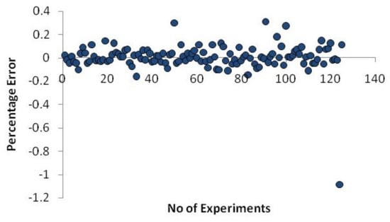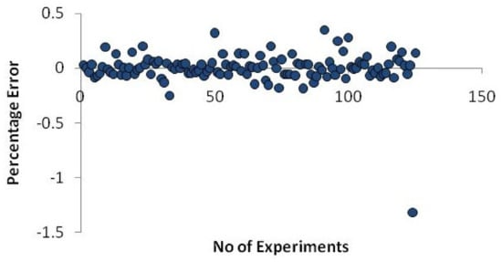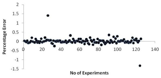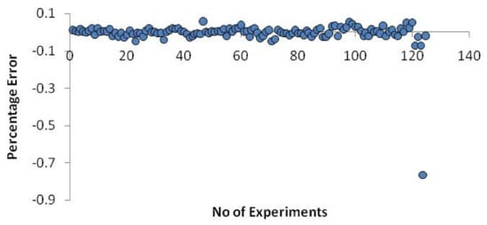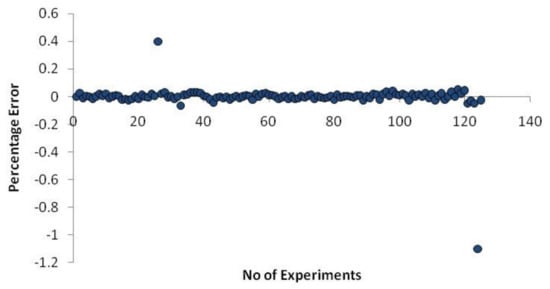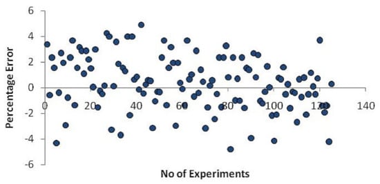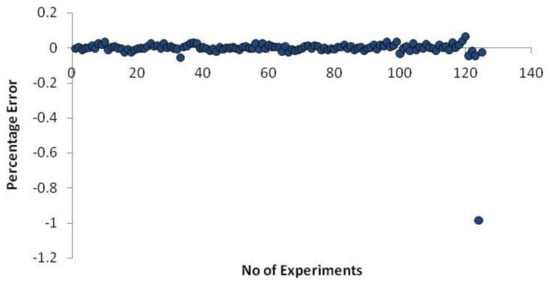 The following Equation (9) is used to calculate the neural network model’s error percentage.