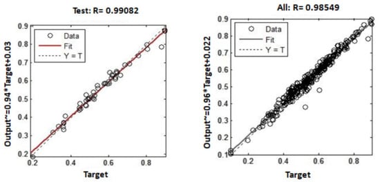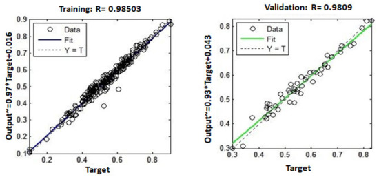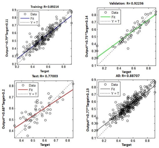 The data must be separated into training and testing data in order to calculate the ratio between the two. For this, there is no particular guideline. However, the proportions can be expressed as 90:10%, 85:15%, 80:20%, and 70:30%. In this study, the 125 experimental data points were divided into three categories: training, testing, and validation. As a result, 87, 19, and 19 experimental samples were used for training, testing, and validation, respectively, out of a total of 125 samples.