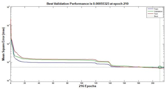 For network training, the Levenberg–Marquardt (LM) algorithm was utilised. The LM algorithm uses an error corrective learning rule. In the LM algorithm, operating phases make use of forward connections, whereas learning phases make use of backward links. Because it is a Hesian-based method and allows the network to learn more delicate characteristics of a complicated mapping, the LM algorithm is preferred over the others. The training phase of the LM method converges quickly as the solution is approached because the Hessian vanishes at the solution. During training, the inputs from the neurons were weighted. Using a tan -sigmoid transfer function, the weight input and bias sum were changed. In a similar manner, the output of the final hidden layer was tailored using a suitable weight, and the sum of the tailored output signal was afterwards modified using a tan—sigmoid transfer function. The complete item was gathered at the output layer. Using a transfer function, the sum of the weight input and bias was modified.
