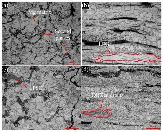 Optical micrographs of the alloy perpendicular (a,c) and parallel (b,d) to the extrusion direction for the (a,b) as-extruded alloy and (c,d) as-aged alloy.