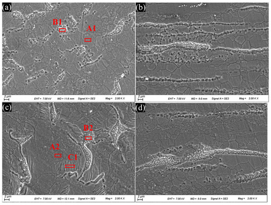 SEM micrographs of the alloy perpendicular (a,c) and parallel (b,d) to the extrusion direction for the (a,b) as-extruded alloy and (c,d) as-aged alloy.