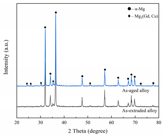 The XRD patterns of the as-extruded and as-aged alloys are shown in Figure 3. The Mg2(Gd, Cu) phase was detected in addition to the α-Mg matrix, which is consistent with the phases under as-cast and solution-treated conditions [30]. Mg2(Gd, Cu) corresponds to the second phase observed using OM and SEM. The volume fraction of the LPSO structure is low so that its diffraction peaks cannot be observed clearly.