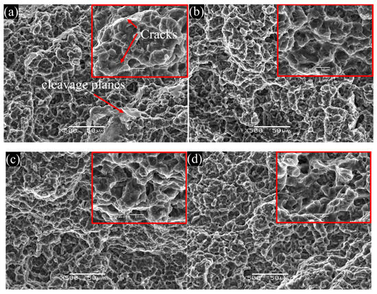 As for elongation at ambient temperature, the tensile elongation in the as-aged alloy (10.4%) is almost twice that in the as-extruded alloy (5.9%). It is well known that the elongation in Mg alloys is related to microstructure [42]. The distribution of the second phase in the as-extruded alloy is relatively uniform, but due to the presence of LEGs, they are difficult to coordinate deformation. When dislocations slip to these grain boundaries, dislocations are hindered and accumulate severely, which is prone to cause stress concentration and eventually result in fracture. Although, these LEGs transform into equiaxed fine grains due to static recrystallization during the aging process that are conducive to coordination and transmission of deformation, thus leading to much better ductility. The fracture morphologies of both alloys under ambient temperature and 93 °C are shown in Figure 4. The cleavage planes for the LEGs and secondary microcracks can be observed in Figure 4a, which play a negative role in ductility, but the fracture morphology of the as-aged alloy at ambient temperature is full of tiny dimples, indicating good ductility. At 93 °C, the tensile elongation in the as-aged alloy increases slightly (only about 7%), but that in the as-extruded alloy increases by 130%, which is mainly due to the occurrence of static recrystallization at this tested temperature since no coarse cleavage planes can be observed in Figure 4c. Furthermore, the residual stress release during the test at 93 °C may also play a positive role in the elongation improvement of the as-extruded alloy.