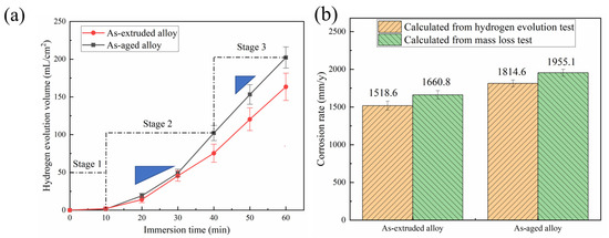 The hydrogen evolution curves of both alloys are shown in Figure 5a. It shows that the hydrogen evolution volume of the as-aged alloy is larger than that of the as-extruded alloy during the 60 min immersion test, indicating a higher corrosion rate. Three corrosion stages can be inferred from the hydrogen evolution curves: (1) in the first 10 min stage, the hydrogen evolution curves of both alloys are relatively flat and stable; (2) during the 10–40 min stage, the slope of hydrogen evolution curve of both alloys increases with prolonging immersion time, indicating an increased corrosion rate at this stage; and (3) during the 40–60 min stage, the hydrogen evolution curves present nearly linear, demonstrating a stable corrosion rate at this stage. This is probably related to the corrosion product on the surface of the alloys [45,46]. At the beginning of immersion, Mg(OH)2 film is formed on the surface of the samples which can protect against further corrosion to some extent. As the immersion time prolongs, the insoluble Mg(OH)2 film reacts with Cl− and generates soluble MgCl2, and the samples undergo rapid corrosion accompanied by thick corrosion products on the surfaces. Then, the continuous penetration of the corrosion solution into the uncorroded surface and the increased corrosion products keep balance, resulting in a stable corrosion rate at the last immersion stage.
