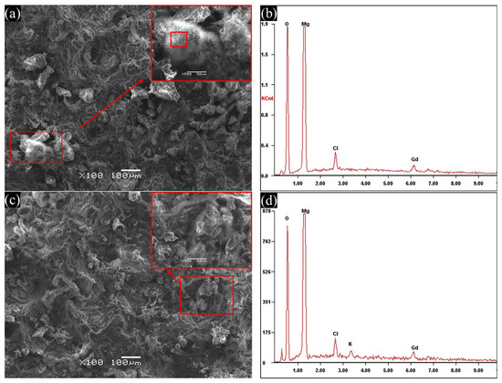 Figure 6 shows the corrosion morphologies of both alloys immersed in 3 wt.% KCl solution at 93 °C for 60 min. The corrosion products on the surfaces can be clearly observed, and there are some bright acicular corrosion products on the top layer. According to the analysis of EDS results in Figure 6b,d, the corrosion products mainly contain Mg, O, and Cl, as well as some K and Gd elements. Since EDS cannot detect the presence of H, combined with other corrosion studies, the surface of the corrosion layer mainly consisted of Mg(OH)2, MgCl2·6H2O, and MgO, and the acicular corrosion products are a mixture of MgO and Mg(OH)2 [3,47].