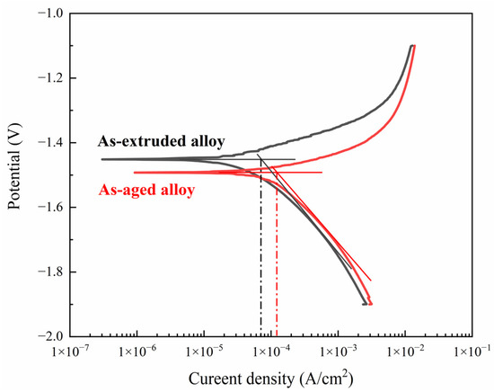 In order to further determine the corrosion behavior of both alloys, the electrochemical polarization curves are shown in Figure 7, and the corresponding fitting results are listed in Table 3. The corrosion potential of the as-aged alloy (−1.50 V) is lower than that of the as-extruded alloy (−1.45 V), which indicates a faster corrosion tendency from thermodynamics, and the corrosion current density of the as-aged alloy is higher as compared to that of the as-extruded alloy, which means a higher corrosion rate from corrosion dynamics [48]. The electrochemical results are consistent with those obtained using the hydrogen evolution and mass loss tests.