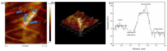 Figure 8 shows the local potential distribution between the α-Mg matrix, second phase, and LPSO phase observed in the parallel extrusion direction. The line in Figure 8a intersects different phases, the three-dimensional volt potential of the tested regions is shown in Figure 8b, and the corresponding volt potential curve of the analyzed line is shown in Figure 8c. The volt potential of the three phases shows the following order: second phase > LPSO phase > α-Mg matrix, which indicates that both the second phase and the LPSO act as cathodes in the microcell to accelerate the corrosion of the matrix.