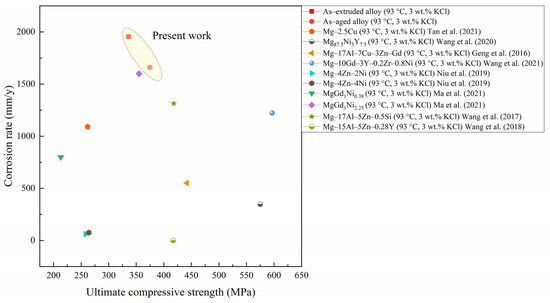 Figure 9 shows the comparison of the ultimate compressive strength and corrosion rate of Mg–6.0Gd–1.2Cu–1.2Zr alloy in this work and other Mg alloys [14,15,25,37,46,55,56,57]. It is clear that the Mg–6.0Gd–1.2Cu–1.2Zr alloy with moderate strength and a high corrosion rate exhibits excellent comprehensive properties that can be effectively applied to the field of temporary plugging. A much higher corrosion rate of the studied alloy in this work may be attributed to the addition of Cu and particular microstructures.