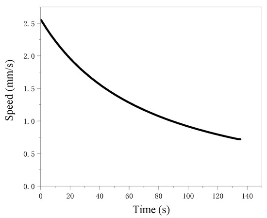 The 2219 aluminum alloy ring selected for this experiment is rolled at 440 °C. In the ring rolling process, as shown in Figure 1, the driver roller provides the driving force for rotation, and the entire ring rolling system rotates through the friction between the ring part and the rollers, while the core roller moves radially at a certain speed, The relationship between time and speed of core roller is depicted in Figure 2, providing the rolling force in the radial direction together with the driver roller, so that the ring part achieves wall thickness reduction. The two conical rollers provide the rolling force in the axial direction to achieve the axial height reduction of the ring. The driver roller, core roller, and conical roller act together on the ring to achieve wall thickness, height deformation, and diameter enlargement of the ring. The process parameters of aluminum alloy rolling are shown in Table 2.