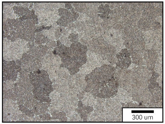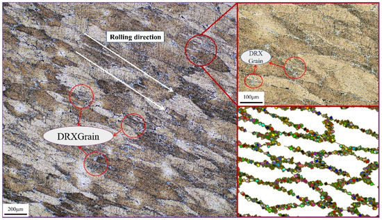 The microstructure of the rolling results is shown in Figure 16. It can be seen that the simulated results and the experimental microstructure have the same isometric structure and clear rolling direction, and recrystallized grains are formed at the grain boundaries. The results show that as the deformation increases during rolling, the deformation energy in the metal increases, and the grains are elongated along the rolling direction due to the rolling pressure. The grain shape after rolling is consistent with the simulation results, while the position distribution of the recrystallized grains is consistent with the simulation results, which verifies the validity of the simulation process.