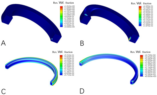 In the entire ring-tying process, due to a large number of rollers, the entire forming process has two forming areas, namely the driver roller and core roller area and the axial rolling area formed by two conical rollers. The entire process is divided into four analysis stages: (1) driver roller bite stage, (2) conical roller bite stage, (3) stable rolling stage, and (4) rolling completion stage. At the beginning of the rolling stage, the first to proceed is the driver roller bite stage, as shown in Figure 10A; due to the radial movement of the core rollers and the drive of the drive rollers, the first dynamic recrystallisation occurs in the area in contact with the core rollers. This is because the deformation in this area causes the dislocation density to increase, after the dynamic recrystallization firstly occurred driven by the temperature and stress conditions. As the rolling process progresses, the deformation zone of the conical rollers also produces DRX, as shown in Figure 10B, where DRX occurs in the contact area because the rolling of the conical rollers in the axial direction increases the energy in the deformed part, thus contributing to the formation of DRX. With the rotation of the workpiece, the initial part of the DRX was due to diffusion, causing the ring to DRX to different degrees, as can be seen in Figure 10C, where the outer surface of the ring has a higher degree of DRX than the inner surface. From Figure 10D, it can be seen that the highest degree of recrystallisation until the completion of the rolling stage is on the outer surface and the intersection of the upper and lower surfaces because in this area, which is the most severely deformed area, the dislocation density changes rapidly, so that the highest percentage of recrystallisation can be achieved, with a maximum dynamic recrystallisation percentage of 53%.